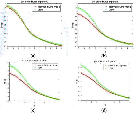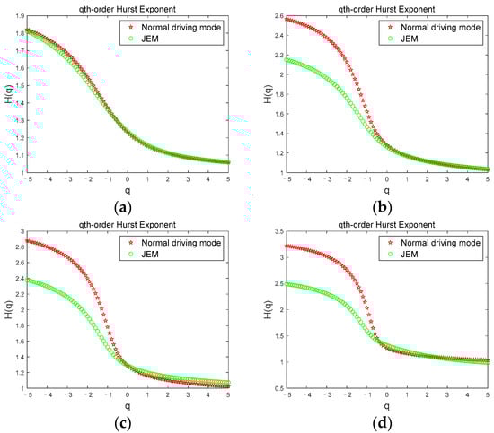 Previous studies have shown that Hurst exponent describes the scaling and power law of signals. For time series signals, if the Hurst exponent shows a regular change trend with the change of q, the sequence has obvious multi-scale characteristics []. In Figure 3, H(q) is a nonlinear function of q, which gradually decreases with the increase of q. It shows the multi-scale characteristics of the time series signal. For different q, there are different exponential powers, representing different power-law autocorrelations. The regular change of Hurst exponent range corresponding to different driving stages also proves the existence of long-range correlation. The Hurst exponent of the θ sub-band in both driving modes in Figure 3a,b increases gradually with the duration of driving time, indicating that during the driving time from the first stage to the fourth stage, the volatility and complexity of the θ sub-band gradually increases. Since the θ sub-band usually appears with fatigue, indicating that the subject has gradually changed from an awake state to a fatigued state, the Hurst exponent clearly shows this fatigue trend.