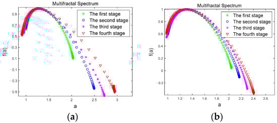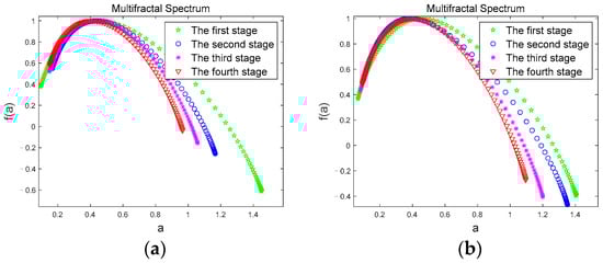 In Figure 7, α is the q-order singularity exponent, which is the embodiment of the singularity in different intervals. f(a) represents the singular dimension under the corresponding singular exponent, also known as the fractal dimension. The width of the multifractal spectrum is recorded as the difference between the maximum and minimum values of α, and is widely used as a parameter to measure the strength of the multifractal. Studies have found that multifractal spectra with larger widths tend to have greater fractal intensity than those with smaller widths, and their inhomogeneity and complexity will also be higher []. In Figure 7a,b, the multifractal spectral width values of the θ sub-band in both driving modes gradually increase with the duration of driving time, indicating the process of driving time from the first stage to the fourth stage, the volatility and complexity of the θ sub-band gradually increase. Since the θ sub-band usually appears with fatigue, indicating that subject gradually changed from an awake state to a fatigued state, the multifractal spectrum clearly showed this fatigue trend.