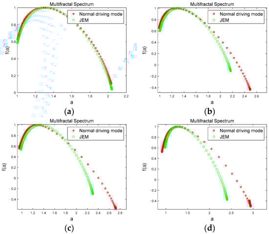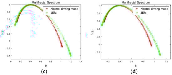 Figure 8 shows the comparison of the multifractal spectrums of θ sub-bands for a subject corresponding to the two driving modes under the four driving stages. From Figure 8, we can see that the multifractal spectrum curves are basically the same, and overlap when the subject is in the first stage (Figure 8a); however, in the second (Figure 8b), third (Figure 8c), and fourth (Figure 8d) stages, the multifractal spectrum width value in JEM mode is smaller than that in the normal driving mode, and there is a significant difference in the multifractal spectrum width value between the two driving modes (|t| = 2.748, t0.05,12 = 2.179, p < 0.05). Since the first stage of data collection was at the initial stage of driving, subjects were all awake at this time. As the driving time continued, subjects’ fatigue gradually accumulated. However, JEM improved subjects’ cognitive load and driving interest through judgment and excitation, and effectively delayed subjects’ fatigue. Therefore, in JEM, the volatility and complexity of the θ sub-band accompanying fatigue states grow significantly less than in normal driving mode.
