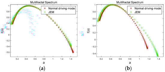 Multifractal spectrum. (a) multifractal spectrum of the β sub-band in Normal driving mode; (b) multifractal spectrum of the β sub-band in JEM.