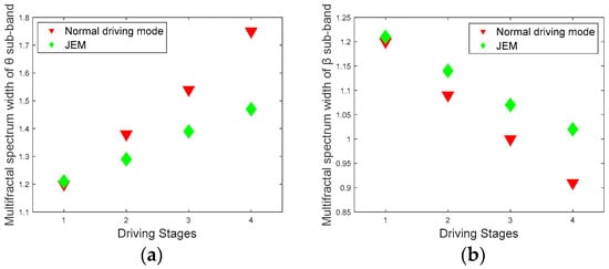Through the comparison of the two groups of multifractal features in Figure 11 and Figure 12, and the statistical analysis of the strength of the multifractal attributes in the two driving modes, it is easier to distinguish the different fatigue states of the subjects. For the Hurst exponents and multifractal spectrograms of the θ and β sub-bands under different driving stages, the multifractal properties of the JEM are significantly better than those in the normal driving mode (Hurst exponent range of θ sub-band: |t| = 5.1552, t0.05,12 = 2.179, p < 0.05; Hurst exponent range of β sub-band: |t| = 3.2475, t0.05,12 = 2.179, p < 0.05; multifractal spectrum width values of θ sub-band: |t| = 3.1129, t0.05,12 = 2.179, p < 0.05; multifractal spectrum width values of β sub-band: |t| = 3.3335, t0.05,12 = 2.179, p < 0.05).