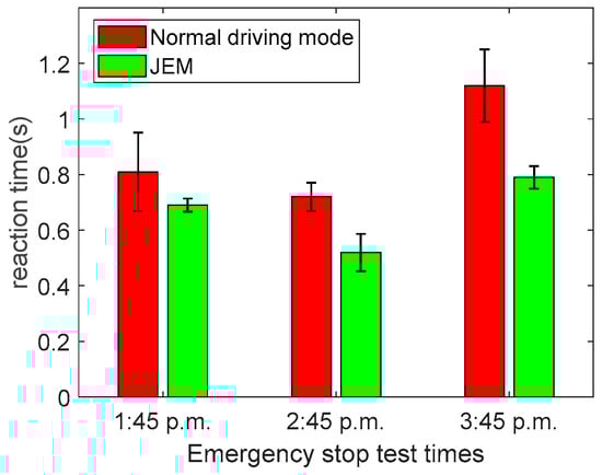 Yi Ching Lee et al. believe that inappropriate cognitive tasks will deepen driver fatigue []. Therefore, we added the emergency stop test in the experiment to ensure that our JEM would not affect the subjects’ ability to deal with unexpected problems. At 1:45 p.m., 2:45 p.m. and 3:45 p.m. in the two driving modes (normal driving mode and JEM), the word ‘stop’ was played through the speaker, and the subjects were asked to step on the brake immediately after hearing the word. Their reaction times were recorded.