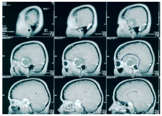 Early sagittal contrast-enhanced T1-weighted sequence images MRI (performed at the initial diagnosis) demonstrated a spherical, extra-axial lesion in the right temporal region. The tumor presented with a characteristic peripheral enhancement that could suggest the hypothesis of hemangioperycitoma.