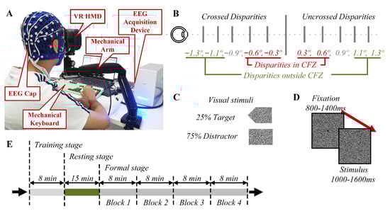 The experimental environment is shown in Figure 1A. Participants were seated on a comfortable, height-adjustable chair in a quiet room with good air condition. An HTC Vive Pro head-mounted display (HMD) was used as the display unit, which features dual displays (one per eye) and each display is a 3.5-inch AMOLED with a resolution of pixels. The refresh rate is 90 Hz, and the horizontal field of view (FOV) of the HMD is . Participants were asked to wear an EEG cap from Compumedics NeuroScan with 64 electrodes during the experiment. In order to reduce interference during EEG collection, the HMD was fixed on an adjustable mechanical arm instead of being worn on the participants’ head.