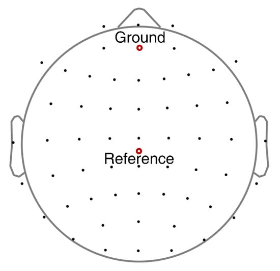 EEG data were collected through the Compumedics NeuroScan SynAmps2 64-channel amplifier head-box. All channels were placed according to the international 10–20 system and covered the whole brain regions. Fifty-six electrodes (FP1, FP2, FPz, AF3, AF4, F1, F2, F3, F4, F5, F6, F7, F8, Fz, FC1, FC2, FC3, FC4, FC5, FC6, FCz, C1, C2, C3, C4, C5, C6, T7, T8, Cz, CP1, CP2, CP3, CP4, CP5, CP6, TP7, TP8, CPz, P1, P2, P3, P4, P5, P6, P7, P8, Pz, PO3, PO4, PO7, PO8, POz, O1, O2, Oz) were used for recording the EEG activities within the scope of this study. The reference and ground electrodes of all scalp channels are shown in Figure 2. EEG data were digitized with a 24-bit analog-to-digital converter with a sampling rate of 1000 Hz. The electrode impedance at each electrode was maintained below .