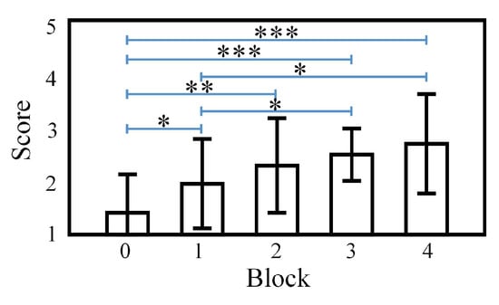 Statistical results of SVF scores for each viewing block. Block 0 refers to the assessment of SVF right before the formal stage begins. *** , ** , * .