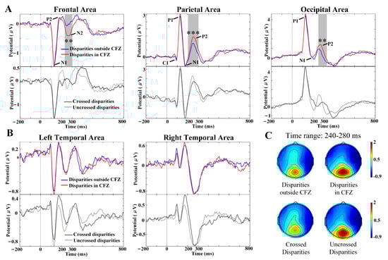 Effects of different disparities on VEPs components. (A) VEPs corresponding heat map and waveform images at frontal, parietal and occipital areas for crossed disparities versus uncrossed disparities, and disparities in CFZ versus disparities outside CFZ. (B) VEPs corresponding heat map and waveform images at left and right temporal areas for different disparities. (C) The topographical varieties of components P2 (time range: 240–280 ms) in the 2 disparity groups. The grey underlining denotes time region of amplitude significant differences after the cluster method corrected, *** , ** .