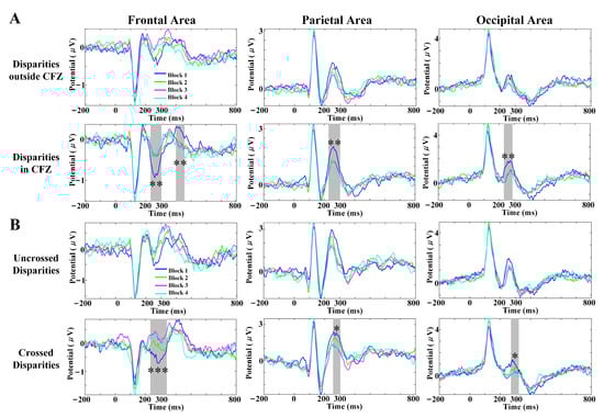 Figure 5 demonstrates the characteristics of VEPs in the frontal, parietal and occipital areas with several SVF levels induced by disparity variation under different disparities. As shown in Figure 5A, the peak amplitudes of disparities in CFZ induced SVF had a significant difference in the frontal (, time range: 236–304 ms; , time range: 400–444 ms), parietal (, time range: 232–304 ms), and occipital (, time range: 236–288 ms) areas (marked with gray underlining, multiple comparisons corrected by the cluster method), which were mainly due to the sharp decrease in amplitudes from Block 1 to the remaining blocks. In Figure 5B, the peak amplitudes of crossed disparities induced SVF show significant difference in the frontal (, time range: 236–340 ms), parietal (, time range: 260–304 ms), and occipital (, time range: 276–320 ms) areas (marked with gray underlining, multiple comparisons corrected by the cluster method). The peak amplitudes of component P2 with disparities outside CFZ, crossed disparity and uncrossed disparity induced SVF showed a similar monotonously decreasing trend along with the increased levels of SVF (block 1–block 3).