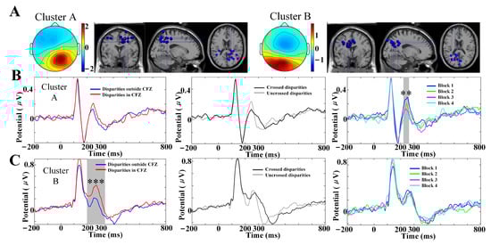Two clusters containing posterior P2 were located in the right parieto-occipital cortices (cluster A, 13 participants, 14 ICs) and left parieto-occipital cortices (cluster B, 10 participants, 14 ICs). Figure 6A shows dipole locations of the clustered ICs and centroids visualized in the MNI brain volume. Additionally, Table 3 displays the coordinates of cluster centroids and the number of participants and sources contained in each cluster. According to the MNI coordinates, both cluster A and cluster B were located in the medial part of the Brodmann area 7 (BA 7), which is also known as the precuneus. Point-by-point repeated-measurement ANOVA was conducted on the VEPs of the two clusters, as shown in Figure 6B,C: sample points of 220–260 ms time interval in cluster A and sample points of 204–336 ms in cluster B, which could be viewed as component P2, varied significantly with blocks (, cluster method corrected) and disparity conditions with CFZ (, cluster method corrected), respectively. The waveform of VEPs in cluster A was quite similar with that in the parietal area (shown in Figure 4A). These findings imply that the VEPs observed in parietal areas are mainly attributed to activities from the precuneus.