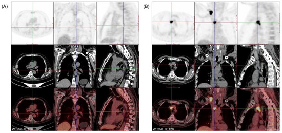 18F-FDG-PET of the patient. (A) Esophageal cancer (after treatment): High accumulation in the middle-lower esophageal section with a maximum SUV of 3.8. (B) Lymph node metastasis: High accumulation in the mediastinum lymph node (region 2R 1.8 cm × 2.2 cm) with a maximum SUV of 17.8.