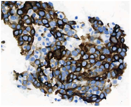 Immunohistochemistry result of tumor cells (40 × 10): CK7(+).