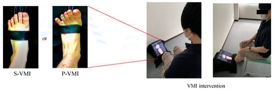 VMI intervention. (1) TheraBand: A TheraBand was used to apply resistance to the ankle dorsiflexion movement. (2) S-VMI: A TheraBand was wrapped around the foot, but no tension was applied. (3) P-VMI: Resistance was applied to the foot using the TheraBand to perform dorsiflexion with maximum effort. (4) Tablet computer: Videos of the ankle joint dorsiflexion movements of either S-VMI or P-VMI were projected on a tablet computer. (5) VMI intervention: Participants observed the video in a sitting position for 5 min. In P-VMI, strong contraction of the tibialis anterior muscle, extension movement of the toes, and activity of the extensor hallucis longus muscle tendon and extensor digitorum longus muscle tendon were clearly observed compared to S-VMI. Abbreviations: P-VMI, Power-VMI; S-VMI, Standard-VMI; VMI, visual-motor illusion.