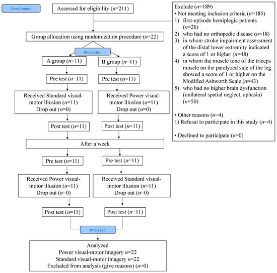 For the sample size estimation, for each additional subject, the post hoc test of G* power 3.1.9.2 (Düsseldorf University; Düsseldorf, Germany) was used to estimate the Cohen’s d of the primary outcome. In addition, the power of the primary outcome was calculated, and subject recruitment was stopped when the power (1-β) exceeded 0.95 [,]. The results of the interim analysis showed that the effect sizes of ankle dorsiflexion angle and ankle dorsiflexion angular velocity before and after the P-VMI intervention were high: power for the ankle dorsiflexion angle was 0.97 and for the ankle dorsiflexion angular velocity was 0.99 (Table 1). Based on these results, we decided to discontinue the study enrollment after recruiting 22 participants.