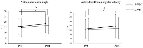 For dorsiflexion angular velocity, pre-intervention values did not differ between P-VMI and S-VMI, and post-intervention values were significantly higher for P-VMI. Although comparing changing rates between interventions showed no significant differences, only the values after the VMI intervention showed significant differences between P-VMI and S-VMI. The effect size of P-VMI was greater than that of S-VMI in terms of dorsiflexion angle and dorsiflexion angular velocity. In addition, SoA and SoO were higher with P-VMI than with S-VMI.
