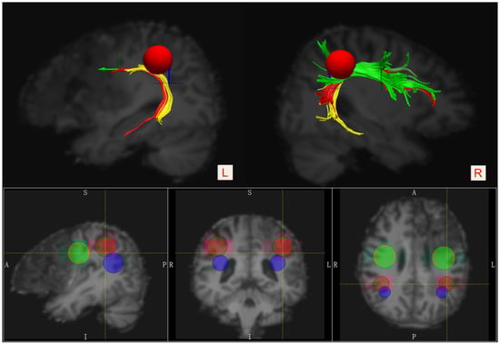 We used the FMRIB Software Library (FSL) [13] 5.0.9 software package (http://fsl.fmrib.ox.ac.uk/fsl/fslwiki/FSL accessed on 20 June 2022) for preprocessing and the analysis of diffusion data. The MRI datasets, including the three-dimensional T1-weighted image series and DTI series, were spatially normalized in the MNI152 atlas space (the MNI152_T1_2mm brain template). The Diffusion Toolkit 0.6.4.1 [14] was used for diffusion imaging data reconstruction and fiber tracking. We also used TrackVis (http://www.trackvis.org/, Charlestown, MA, United States; accessed on 20 June 2022) version 0.6.1 software to manually draw regions of interest (ROI) and perform fiber track visualization. A three-ROI approach was used to accomplish virtual dissection of the bilateral arcuate fasciculus (AF) based on the deterministic fiber-tracking approach: a Frontal ROI (ROI 1, the green 2D disk) was manually placed on the coronal slice at the entrance to the frontal lobe (anterior to the central sulcus), a Temporal ROI (ROI 3, the blue 2D disk) was manually placed on the axial slice at the entrance to the temporal lobe (below the Sylvian fissure), and a Parietal ROI (ROI 2, the red 3D sphere) was manually placed tangent to the inferior parietal cortex [15,16]. (Figure 2). The anterior segment of the AF was defined when the tract passed through both the ROI 1 and ROI 2, but not the ROI 3, the posterior segment was defined when the tract passed through both the ROI 2 and ROI 3, but not the ROI 1, and the long segment was defined when the tract passed through both the ROI 1 and ROI 3, but not the ROI 2. All ROIs for both hemispheres were obtained on fractional anisotropy images. Fiber tracking was initiated with fractional anisotropy (FA) > 0.20 and an angle threshold of 35°.