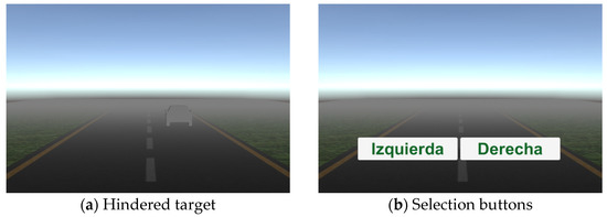 The 2AFC test was based on the signal detection theory (SDT), involving the selection of one of two options for searching for a target in a noisy environment that hinders signal detection [26]. Our test presents a series of trials in which a car silhouette (target) is randomly placed either on the left or right road (two alternatives of choice) in a foggy environment (noise); an example of this is shown in Figure 1a. To begin the test, the participant clicks the start button, and immediately a car silhouette is presented for 300 ms. After this time, labels of “Izquierda” (left) and “Derecha” (right) appear (Figure 1b), and the participant must choose one of them by clicking. Then, a new trial begins.