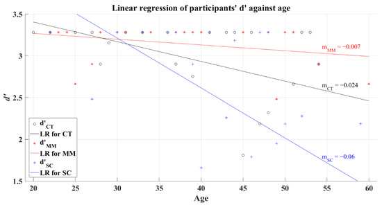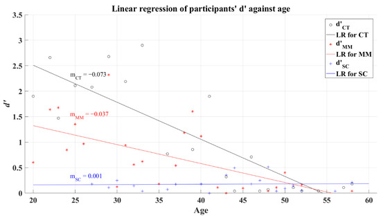 The relationship between the efficiency index d’ and the participants’ age was tested under a correlation analysis with a significance value of 0.05, obtaining a significant correlation for CT group (R = −0.448, p = 0.013) and SC group (R = −0.522, p = 0.002). Conversely, MM group (R = −0.33, p = 0.115) did not present a significant correlation between these variables. Assuredly, the visual system reduces its sensitivity because of aging, predicting a reduction in cognition performance [35]. Based on this fact, it is expected that the participants present a decline over the d’ as their age increases, which could be identified through a negative slope computed with linear regression. To illustrate this expected behavior, Figure 6 shows the results from the regression for each group, where the computed slopes resulted in negative values for the corresponding lines of each group (CT’s R2 = 0.248; MM’s R2 = 0.092; SC’s R2 = 0.37).