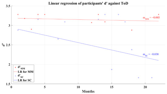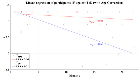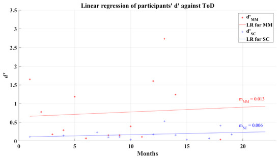 To evaluate if ToD affects d’, a correlation analysis was performed. Coefficients for both groups showed a non-significant correlation, and computed values were R = −0.226 (p = 0.287) and R = −0.219 (p = 0.229) for the MM and SC groups, respectively. Consequently, it might be possible to anticipate different levels of influence independently of the elapsed time from the patients’ recovery in this study. The linear regression behavior for the MM group (R2 = 0.024) tends to be represented as a horizontal line rounding a high value of d’ independent to ToD, as can be seen in Figure 7. In particular, the SC group regression was marked with a line of negative slope (R2 = 0.078), demonstrating that this group can even present lower values of d’ after long ToD (see Figure 7). It is important to keep in mind that the non-correlation between the value of d’ and ToD prevents us from taking this behavior as the main representative of the SC group.