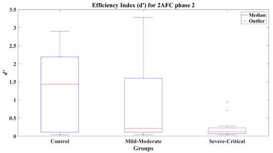 Efficiency index d’ for 2AFC phase 1 (2AFC-P1) by group.