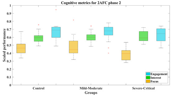 Cognitive metrics for 2AFC-P1 by group. Red line—median value of Focus, Interest, and Engagement for the corresponding group; red plus sign (+)—Outliers for the corresponding performance metric.