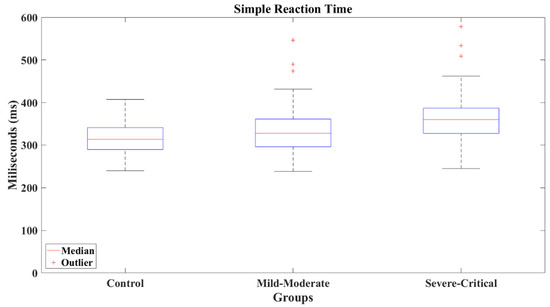 At the beginning of the pandemic, the middle-aged population was found to be the most affected by the COVID-19 virus, presenting many severe-critical cases [36]. Therefore, it was found to be interesting to analyze whether there is a difference between adult and middle-aged participants in tasks of visual-based decision and simple reaction times. As shown in Table 1, the participants in the post-COVID Severe-Critical group for this study have a mean age of 43.65 years (SD = 9.20 years); after dividing the Severe-Critical group by adults and middle-aged participants, each subgroup presents an average age of 36.57 (SD = 6.57) and 51.33 (SD = 3.88) years, respectively.
