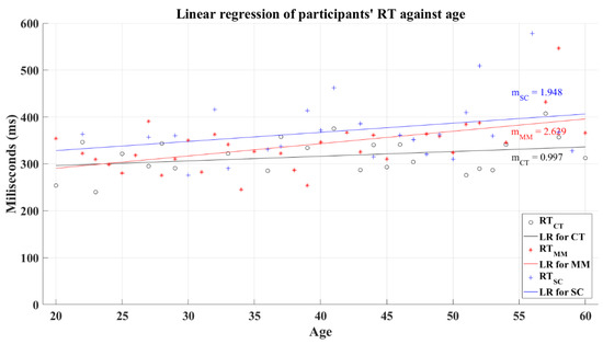Linear regression for participants’ average reaction time versus age. Black line—linear regression for Control group (LR for CT); red line—linear regression for Mild-Moderate post-COVID group (LR for MM); blue line—linear regression for Severe-Critical post-COVID group (LR for SC); , Control group’s reaction time; , Mild-Moderate group’s reaction time; , Severe-Critical group’s reaction time; , Control group’s slope; , Mild-Moderate group’s slope; , Severe-Critical group’s slope.