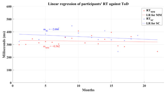 The relation between the participants’ average reaction time and the ToD for post-COVID groups does not have a significant correlation. In this analysis, the MM group had a coefficient of correlation of R = 0.157 (p = 0.209) and SC group’s coefficient had a value of R = −0.149 (p = 0.378). The linear regression for the reaction time and the ToD for these groups resulted in lines with a negative slope for the SC group and a quasi-horizontal line fixed at a central reaction time value independently of the value of ToD for the MM group, as is shown in Figure 15. As a result of the regression, the MM group had a resultant coefficient of determination R2 = 0.007, while the SC group had a coefficient R2 = 0.055. These behaviors mark the performance decrease in reaction time and in the processing information speed, for the SC group as the ToD increments; meanwhile, the MM group shows a “constant” value for the reaction time for all the recovery periods. Still, these tendencies must be taken with caution due to the absence of correlation between the reaction time and the ToD.