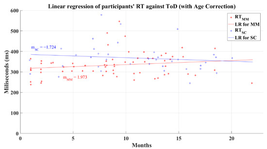 Unexpectedly, after correcting the reaction times for age influence, the linear regression for the MM group (R2 = 0.03) showed a different behavior (showed in Figure 18) to its previous behavior with an uncorrected age effect (see Figure 15) by presenting a positive slope, which might be interpreted as a small increment of the reaction times as the recovery time increments, revealing a possible diminution in the information processing speed. However, correlation analysis showed again that reaction time and ToD still do not present a relation for any post-COVID group; the MM group has a correlation value R = 0.174 (p = 0.163) and the SC group presents a correlation value of R = −0.132 (p = 0.437). The linear regression for the SC group (R2 = 0.017), shown in Figure 18, maintained a similar behavior after the age correction, as seen in its uncorrected counterpart (see Figure 15).