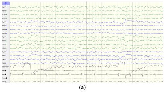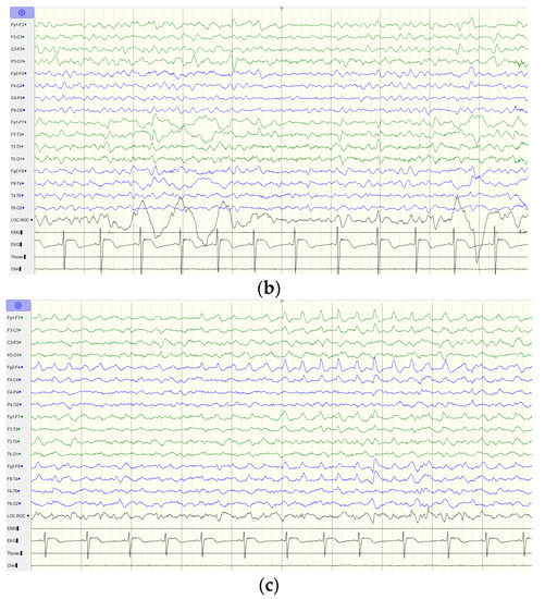 Thereafter, he displayed a downhill course with progressive deterioration. At the age of 8 years 6 months, he was unable to walk unassisted and showed cardinal features of parkinsonism, including no facial expression, start hesitation, small steppage gait, and postural instability while walking. Reduced pain sensation following a fall was observed. By the age of 10 years, he had an epileptic seizure, which was described as eye staring, eye deviation to the right side, and yelling, followed by generalized tonic–clonic seizures. At the age of 11 years, the electroencephalography (EEG) showed generalized background slowing and continuous rhythmic 3 to 4 Hz slow waves on the left frontal, temporal, and occipital regions (Figure 3a). From the age of 12 to 13 years, two interictal EEGs showed a pattern of rhythmic delta wave on the left hemisphere that became diffuse at the age of 13 years (Figure 3b,c). At age of 13 years 11 months, brain MRI revealed progressive changes over the whole thalamus and the aforementioned lesions accompanied by evident cerebellar atrophy (Figure 1g–i). At the age of death at 14 years and 3 months, he was wheelchair-bound, nonverbal, had profound intellectual disability, had difficulty swallowing, and exhibited brisk DTRs with generalized spasticity and rigidity, as well as dystonia.