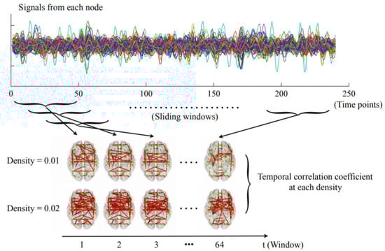 The dynamic networks were constructed as summarized in Figure 1. First, the mean time series were extracted from each node by averaging the signals of all voxels within that node. The widely used sliding-window approach was then applied with a window length of 100 s and an incremental step of 6 s as recommended [12,38,39], dividing the time series into 64 time windows. Within each window, the whole-brain connectivity matrices were calculated using pairwise Pearson correlations. The connectivity matrices were then thresholded with a wide range of densities ranging from 0.01 to 0.50 with an increment interval of 0.01 [40]. For each density, only the connections that survived the given threshold were reserved and assigned a value of 1, and those that did not survive were assigned a value of 0. As a result, a dynamic network G = (Gt)t = 1, 2, 3, …, 64, where Gt is the binary subgraph representing brain dFC within the tth time window, was acquired at each density for each subject. The temporal correlation coefficient was then computed at each density separately.