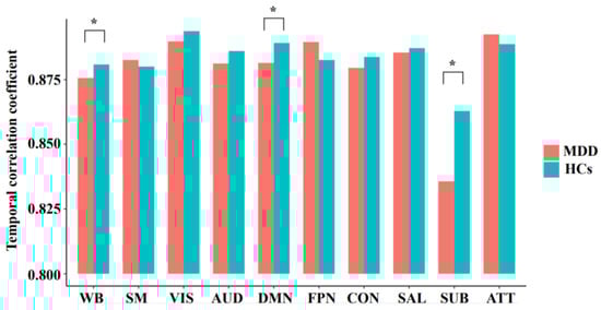 The mean temporal correlation coefficients of the whole brain and each network in the groups of major depressive disorder (MDD) and healthy controls (HCs), after adjusting for age, sex, and education. WB, whole brain; SM, sensorimotor network; VIS, visual network; AUD, auditory network; DMN, default mode network; FPN, frontoparietal network; CON, cingulo-opercular network; SAL, salience network; SUB, subcortical network; ATT, attention network; * significant difference with corrected p < 0.05.