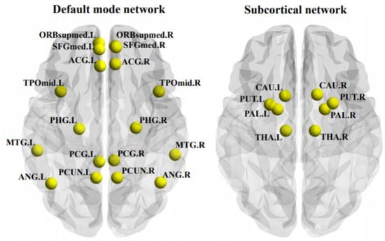 The components of the default mode network and subcortical network, of which the temporal correlation coefficients were significantly decreased in the patients with major depressive disorder. ACG, anterior cingulate cortex; ANG, angular gyrus; CAU, caudate; L, left hemisphere; MTG, middle temporal gyrus; ORBsupmed, medial orbitofrontal cortex; PAL, pallidum; PCUN, precuneus; PHG, parahippocampal gyrus; PUT, putamen; R, right hemisphere; SFGmed, medial superior frontal cortex; SPG, superior parietal gyrus; THA, thalamus; TPOmid, middle temporal pole.