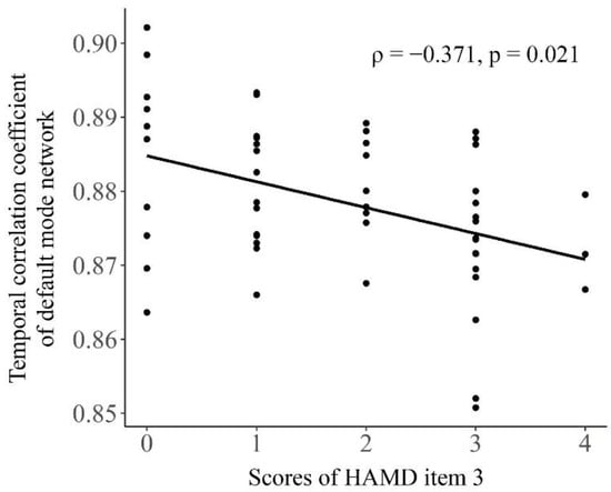 In MDD patients, the scores of HAMD item 3 were found to significantly negatively correlated with the temporal correlation coefficient of the DMN (Spearman’s rho = −0.371, FDR-corrected p = 0.021, Figure 4) but not with the temporal correlation coefficient of whole brain or any other network (all p > 0.05). No significant correlations were found between the total scores of HAMD and the temporal correlation coefficient of whole brain or any network, either (all p > 0.05).