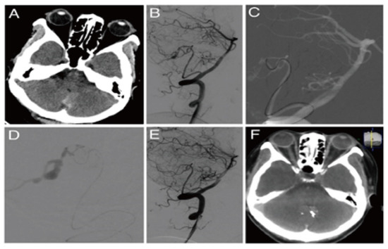 - Chen, Z.; Yang, Y.; Miao, H.; Chen, J.; Luo, C.; Feng, H.; Zhu, G. Endovascular treatment of ruptured peripheral intracranial aneurysms. Neurosciences 2012, 17, 133–138. [Google Scholar] [PubMed]