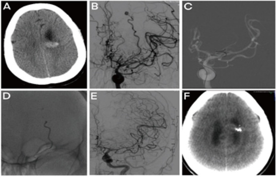 Moyamoya disease with a peripheral hemorrhagic aneurysm. (A) Preoperative CT revealed periventricular and ventricular hemorrhage. (B) Left internal carotid arteriography revealed smoky vascular hyperplasia with a false aneurysm at the end of the lenticulostriate artery. (C) The parent vessels were too tortuous and slender for super-selection. A Marathon microcatheter was located at the beginning of the parent artery. (D) Glubran was used to block the parent artery with satisfactory diffusion to the distal aneurysm cavity. (E) After the embolization, the aneurysm and parent artery disappeared on arteriography. (F) Postoperative CT revealed that the position of the glue coincided with the location of a brain hemorrhage.