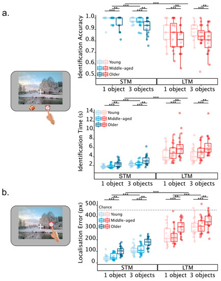 Data were not normally distributed. Due to the differences in skewness between STM and LTM, there were no appropriate transformations that would allow us to include data across both durations in the same parametric analyses. Therefore, non-parametric rank-based mixed factorial models were used to analyse identification accuracy, response time, and localisation error data. They were implemented using nparLD package version 2.1 on R. The age factor (young, middle-aged, and older groups) varied between participants. Memory duration (STM and LTM) and set size (1 and 3 objects) were manipulated within participants. ANOVA-type statistics (ATS) are reported due to their suitability for smaller samples, and modified ATSs (ATSMod) with Box approximation were used for the between-subject factor of age group [49,50]. Where multiple comparisons were made among the three age groups, Mann–Whitney U tests were used, and the alpha level was Bonferroni-adjusted for the three comparisons.