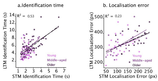 To explore the relationship in performance between the two memory durations, we first ran a GLM that included STM identification response time and age group as predictors and a two-way interaction term between these two factors. The interaction did not reach statistical significance (p = 0.09), indicating that participants’ age did not significantly modify the relationship between STM and LTM identification response times. We. Therefore, simplified the model by excluding the interaction term. This did not significantly impair the model fit (p = 0.09). The resulting model, which included the STM identification response time and age group as predictors, showed that after accounting for the variation in STM identification response times, the main effect of group was not statistically significant (p = 0.34). The model was therefore simplified further by removing the age group. This also did not impair the model fit (p = 0.34). The final model demonstrated that STM identification response times alone significantly predicted LTM response times (F(1, 58) = 64.46, p < 0.001, R2 = 0.53). Participants who were slower when identifying objects from STM were also more likely to be slower when faced with LTM identification (Figure 3a).