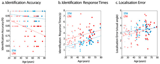 Variation of performance on both STM and LTM retrieval tasks across age in Experiment 2. Dots represent individual participants’ means (a) Identification Accuracy. Overall, ageing impaired performance on both memory tasks, with the worst performance in the LTM trials. (b) Identification Response Times. Overall, participants were slower in the LTM task and both short- and long-term memory trials were influenced by ageing. (c) Localisation Error. Performance was significantly less accurate for older than younger adults in identifying the location of the target object. Dots represent individual participant’s means.