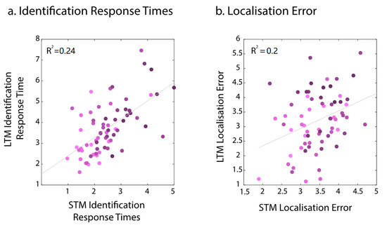 The relationship between STM and LTM for Identification times (a) and localisation errors (b) in Experiment 2. Dots represent individual participants’ means. Saturation changes reflect the age of participants.