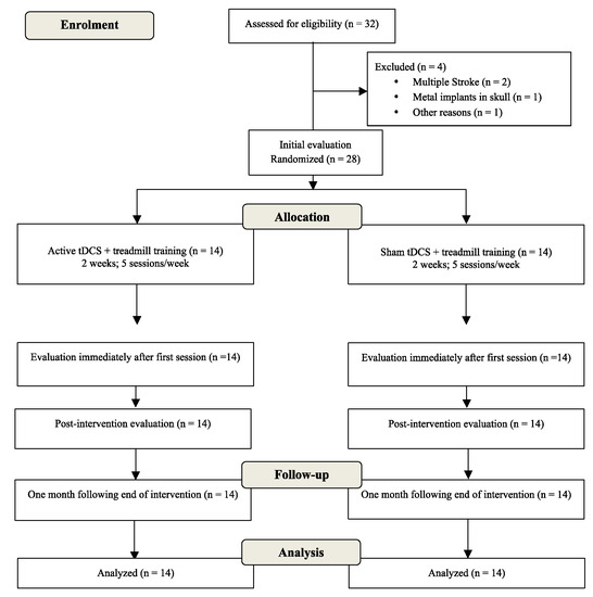 No studies were found in the literature addressing the effects of tDCS combined with treadmill training on spatiotemporal and kinematic gait variables in this population. The hypothesis tested in the present investigation is that anodal tDCS over the damaged motor cortex can enhance the effects of treadmill training. Therefore, the aim of this study was to investigate the effects a single session as well as 10 sessions of anodal tDCS combined with treadmill training on spatiotemporal and kinematic gait variables in stroke survivors and determine whether these effects are maintained one month after the end of the 10-session intervention.