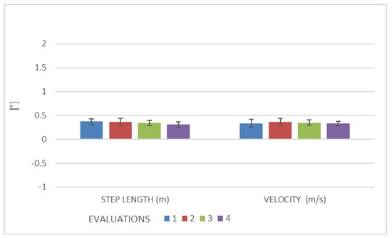 The results of the spatiotemporal gait variables in the two groups are summarized in Table 2. No significant improvements (p > 0.05) in the spatiotemporal variables were found among evaluations in either group (Figure 2).