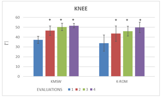 Outcomes of kinematics gait variables, for knee joint of the paretic side, expressed as median values and the interquartile range. + Statistically significant difference in comparison to baseline (p < 0.05). KMSW = maximum angle of knee flexion in swing; K-ROM = range of motion of knee on the sagittal plane.
