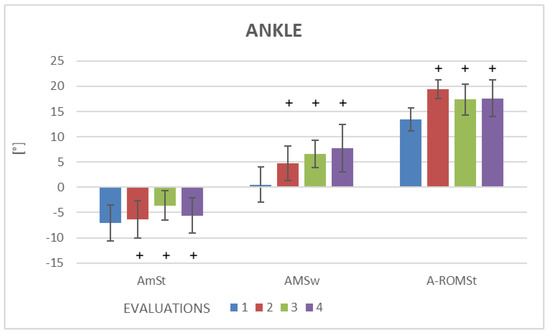 Kinematic gait variables in the two groups are displayed in Table 3. No statistically significant differences were found on the non-paretic side in the two groups (Table 3). For better visualization of the results, Table 3 only displays kinematic variables on the paretic side. Significant improvements were found for the pelvis, hip, knee and ankle (p < 0.05) (Table 3). In the EG, the intra-group analysis revealed significant improvement in kinematic knee variables (KMSw and K-ROM) (Figure 3) and ankle variables (AMSt, A-ROMSt and AMSw) (Figure 4) at Evaluations 2, 3 and 4 (Table 3). The inter-group analysis revealed statistically significant differences in the EG in comparison to the CG regarding a kinematic knee variable (KMSw) at Evaluation 2, kinematic hip variable (HAA-ROM) and kinematic pelvis variable (PT-IC) at Evaluations 2 and 3 (Table 3). No statistically significant differences were found in the CG for any of the variables evaluated on either the paretic or non-paretic side (p > 0.05) (Table 3).