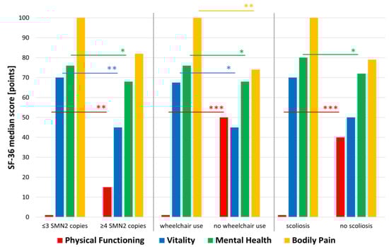 Association of the SF-36 dimensions Physical Functioning, Vitality, Mental Health, and Bodily Pain with patients’ characteristics. While patients with a more severe disease (≤3 SMN2 copies, wheelchair use and scoliosis) reported low scores in the dimension of Physical Functioning, they reported better Mental Health and Vitality and less Bodily Pain. Abbreviations: SMN2 = survival motor neuron 2 gene; SF-36 = Short Form Health survey 36; * p ≤ 0.05; ** p ≤ 0.01; *** p ≤ 0.001.