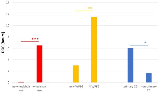 A higher DOC was associated with wheelchair use (p < 0.001, n = 49; median = 0 h vs. median = 6.5 h) and the use of NIV and PEG (p = 0.002, n = 49; median = 3 h vs. median = 11.5 h). Further, the DOC was significantly higher for primary caregivers (median = 6.00, n = 37) compared to non-primary caregivers (median = 1.63, n = 11) (p = 0.036), as anticipated (Figure 2).