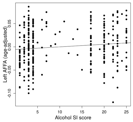 The left AFFA was associated with alcohol dependence risk (Figure 2). In a multiple regression to predict alcohol dependence risk based on AFFA and age, a significant regression equation was found (F(2,321) = 5.813, p = 0.0033) with an R2 of 0.29 in the left AFFA. The predicted alcohol dependence risk is −3.18 + 26.02 (left AFFA) + 0.067 (age). The left AFFA (p = 0.028) and age (p = 0.0044) significantly predicted alcohol dependence risk. However, the right AFFA did not show a significant association with alcohol dependence risk.