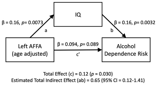 Mediation analyses for the left AFFA (age-adjusted) on the number of alcohol dependence risk, directly (c’) and indirectly through IQ (ab).