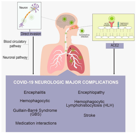 Even though other betacoronaviruses have comparable characteristics, only a few studies have shown SARS-CoV-2 brain infection in vivo. A neuronal and hematogenous bridging of the blood–brain barrier has been postulated considering recent discoveries that SARS-CoV-2 host cell entrance receptors exist as components of human neurons and vascular tissue. COVID-19 neurological symptoms may be a consequence of both the neuroinflammation generated by the “cytokine storm” and coexisting diseases.