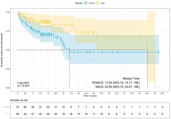 The median time to the development of a thyroid disorder was significantly lower in females compared to males (17.0 vs. 42.6 years, p = 0.04), Figure 1. Compared to males, females had a higher risk of thyroid disorder (HR = 2.00, 95% CI, 1.02 to 3.95: log-rank p = 0.04).