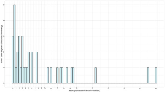 In Figure 2, we present the frequency distribution of diagnosis of new thyroid abnormality over the course of Li treatment. In our study, 7% of patients developed thyroid disorders within one year of lithium therapy and 60.5% of patients developed thyroid disorders within five years of lithium therapy. More than one-third of patients developed thyroid disorders after five years of lithium therapy.